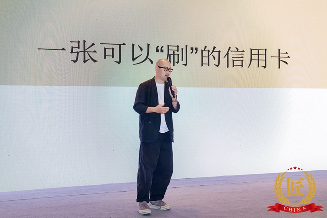 朱小海也分享了自己“旧艺新生”的杰作,例如:因为寻找传统纸雕工艺和罗易成结缘的、为中华老字号“中华牌”桂花陈酒设计的新包装和品牌标识“桂花树下”;参加“蜀春行”传统手艺研学采风时,接触绵竹木版年画让他有了灵感,基于传承人贾君做的财神木版年画,设计成民生信用卡卡面,成了一张真正可以刷(财神)的信用卡;2018年4月,朱小海凭借《老字号复兴“一得阁”》入围2017年度中国设计权力榜Design Power 100榜单;巧借径山寺开山祖师参禅处的那块喝石的“喝”字,与茶人任政林联合设计的径山石壶,名为“喝壶”;还有故宫文化的衍生品中秋系列的“花好月圆”盛物铜盘等。