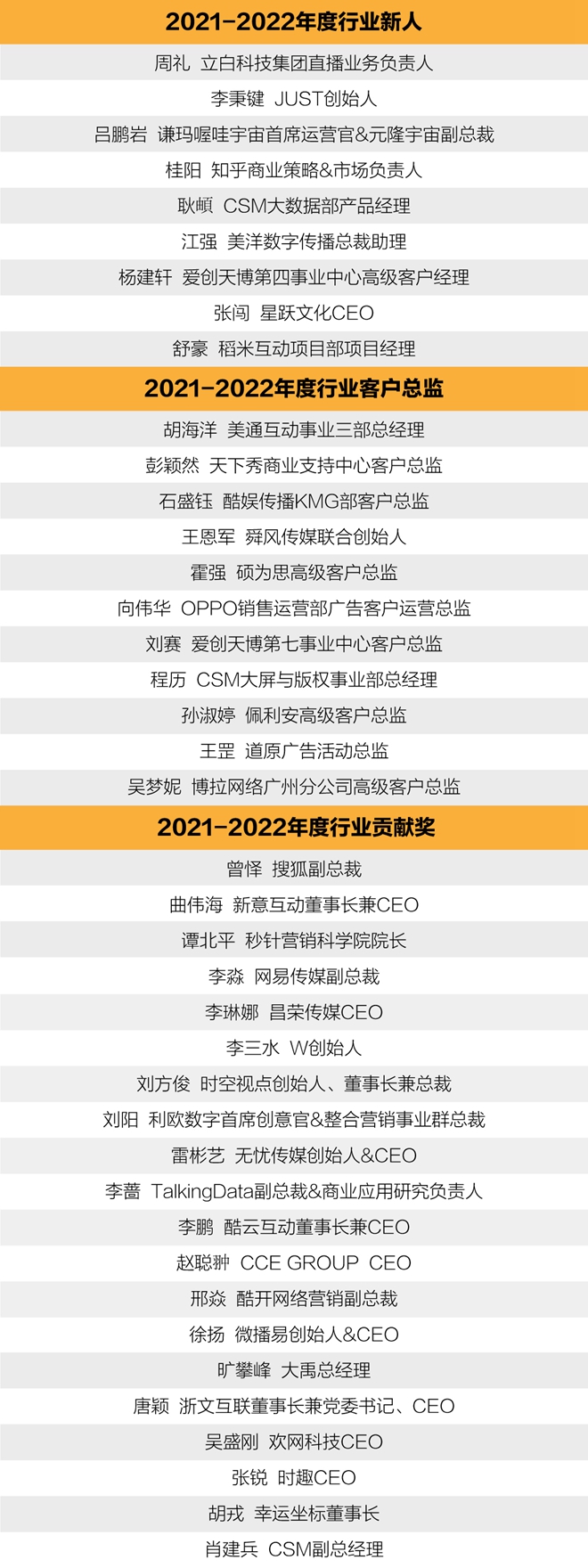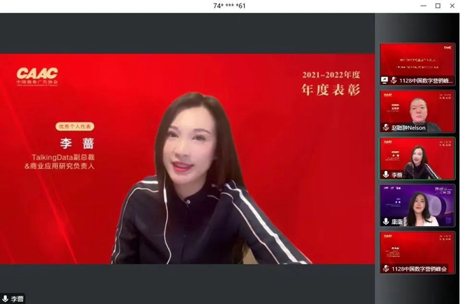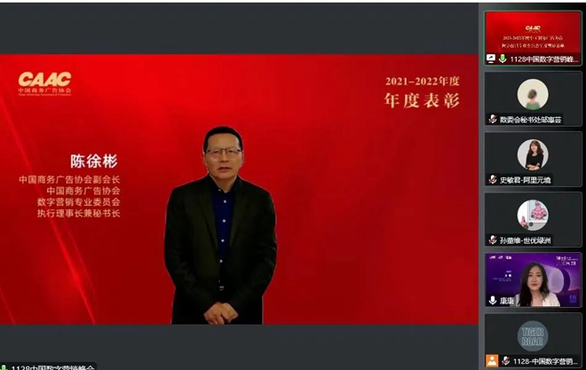 中国商务广告协会数字营销专业委员会每两年会对年度优秀会员单位及个人进行年度表彰。2021年、2022年,在经历疫情常态化、行业回归理性下,数字营销行业也经历更多不确定性。为了表彰先进,树立典型,进一步鼓励会员单位积极参与行业活动,经数委会四届理事会投票,四届常务理事会第二次会议审核通过,并报经协会批准,中国商务广告协会驻会副会长、数委会执行理事长兼秘书长陈徐彬于峰会上宣读了《2021-2022年度优秀数字媒体平台》、《2021-2022年度优秀数字技术公司及大数据应用》、《2021-2022年度优秀第三方数据服务机构》、《2021-2022年度优秀品牌机构》、《2021-2022年度优秀数字营销策划与代理机构》、《2021-2022年度行业新人》、《2021-2022年度行业客户总监》、《2021-2022年度行业贡献奖》获奖名单。并对以上获奖单位及优秀个人表示衷心的祝贺。