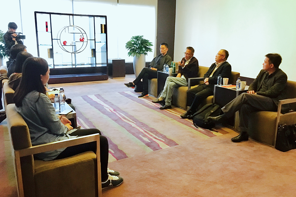 中国商务广告协会副会长高峻、宋秩铭、丁俊杰及战略合作伙伴代表华谊嘉信吴孝明接受采访(左起)